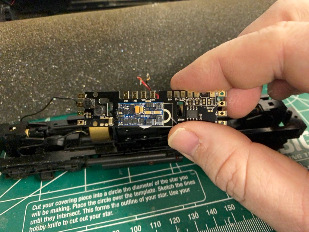 The existing decoder was removed and replaced with a Loksound 5 Direct, since it’s a snap-in fit to the drive. I took a progressive approach to installing this decoder, wiring one aspect at a time before checking it on the layout. Soldering everything at once and hoping it all works is a recipe for disaster.