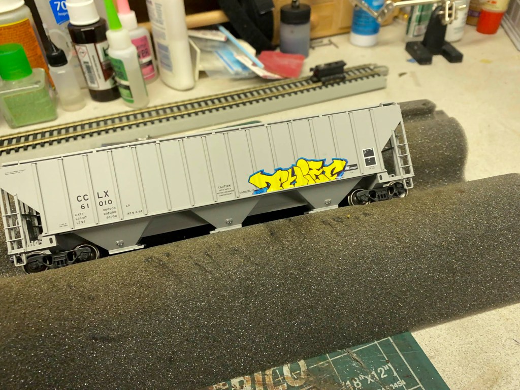 Since I had everything setup for decaling, I went ahead and tagged a few of my covered hoppers, which always seem to get hit more than tank cars or other rolling stock. Blair Line includes versions that feature a straight bottom edge to help replicate the common style of railroad graffiti.