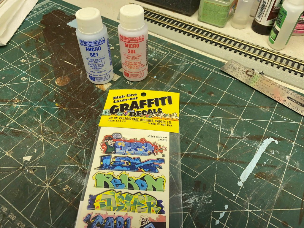 There’s nothing ground breaking about my decaling process. Dip it in warm water, slide it in place, then apply a generous amount of Microscale Micro Set solution, and let it dry. Depending on how old I want the graffiti to appear, I’ll add some weathering powders or other materials after it’s dry and set.