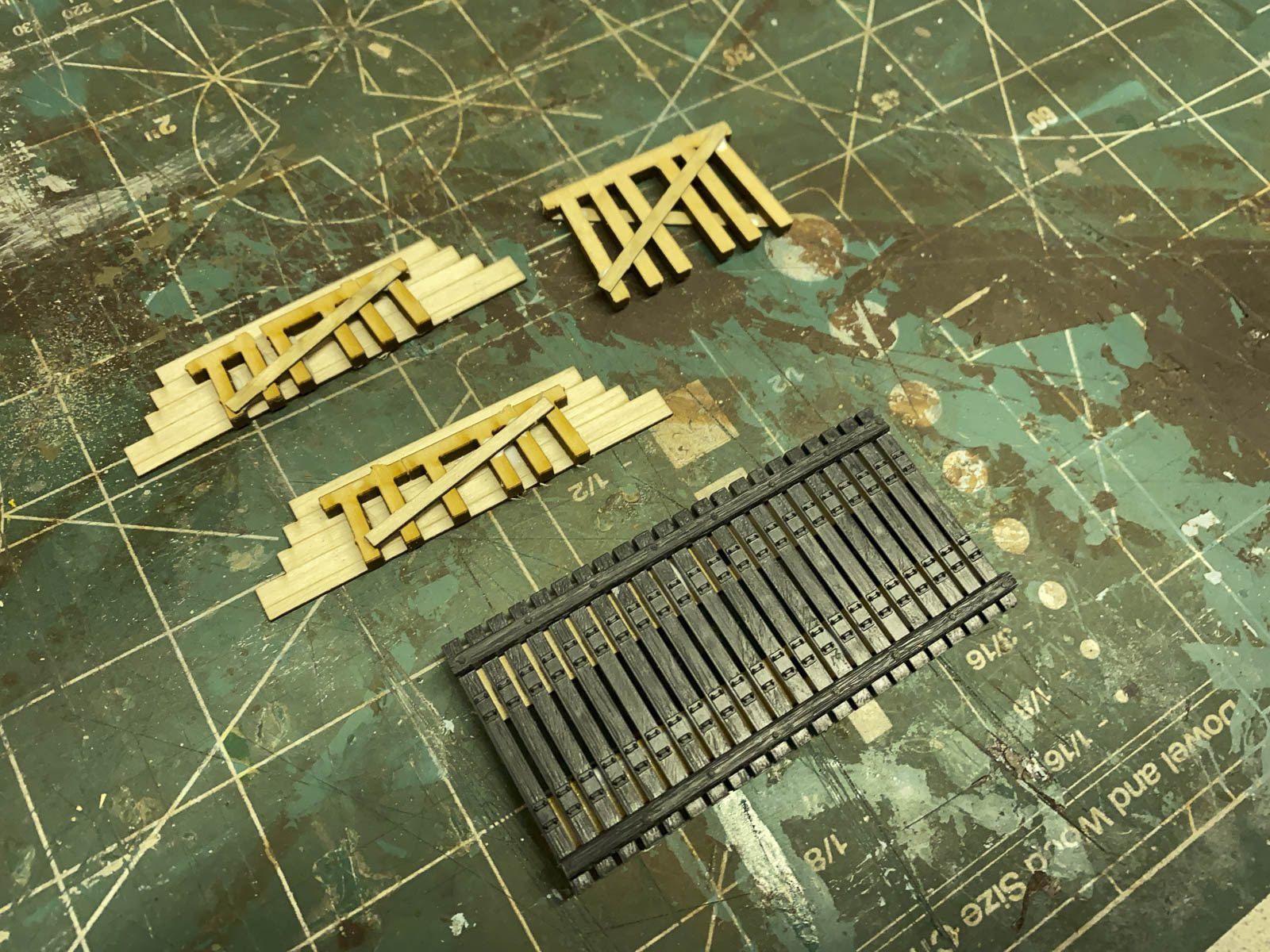 To model the bridge, I combined parts from Central Valley Model Works and Monroe Models. Central Valley’s bridge ties make for an inexpensive solution to the ties, while Monroe’s Hobo Creek kit does the same for the supports. I shortened the Monroe kit to fit a section of CVMW bridge ties, but otherwise built the kit as designed.