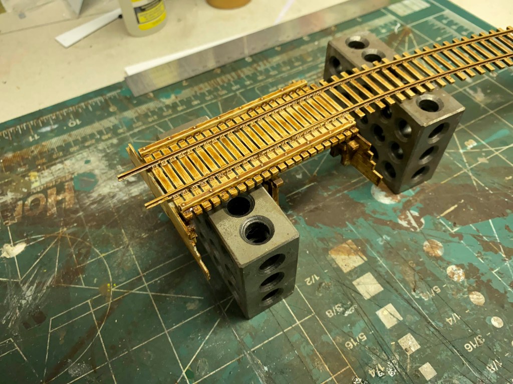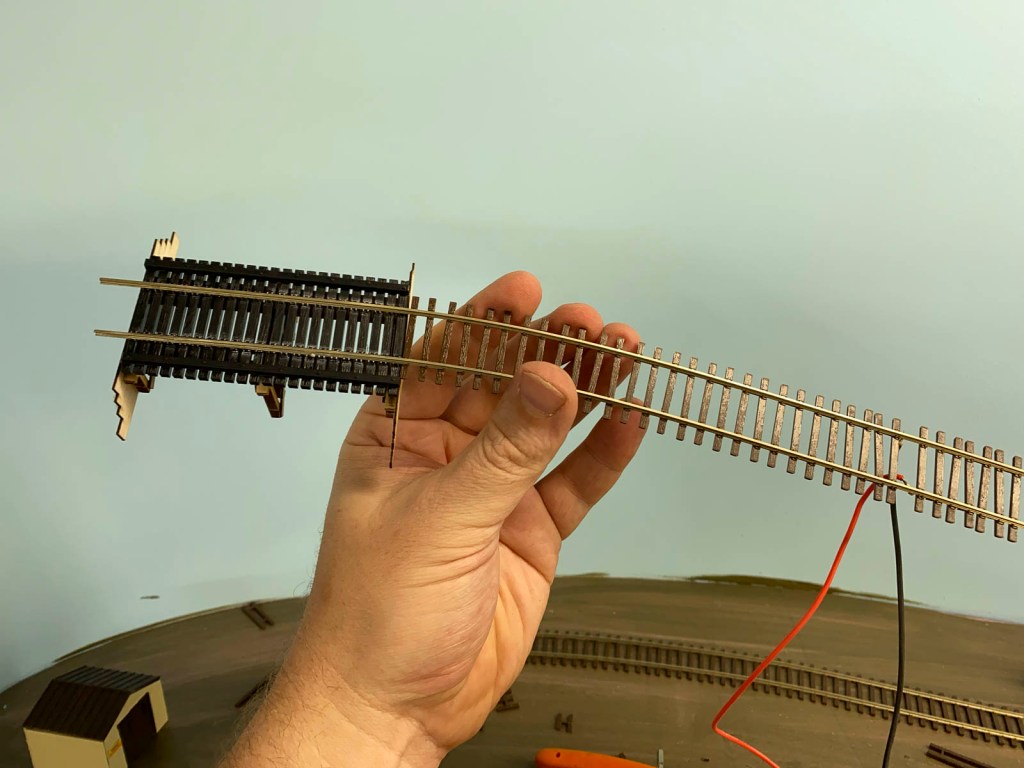 I then took a piece of Micro Engineering Code 70 flextrack and, as I’ve previously documented, attached it to the bridge ties so that the rails are continuous over the trestle. This avoids rail joints on the bridge, and also eliminates having to wire the bridge track separately and having to figure out how to hide the feeder wires.