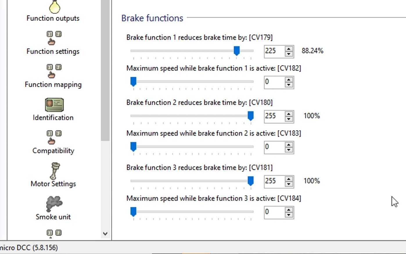 On top of that, the template adds braking to the coupling process. When triggered, all three brakes in a Loksound v5 decoder are activated. I maxed out the CV values for Brake 2 and 3, while leaving Brake 1 to be used for the independent brake on my ProtoThrottle. With all three brakes on, the locomotive stops on a dime to help simulate the force that occurs when two cars connect. It will also drop the prime mover to idle.