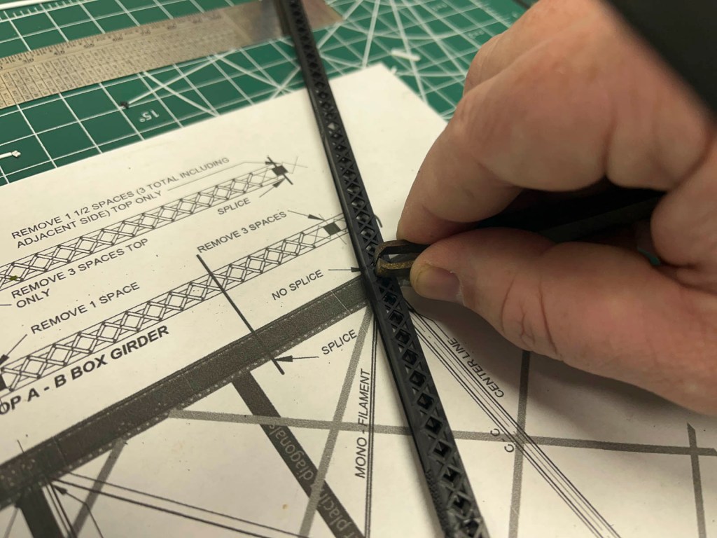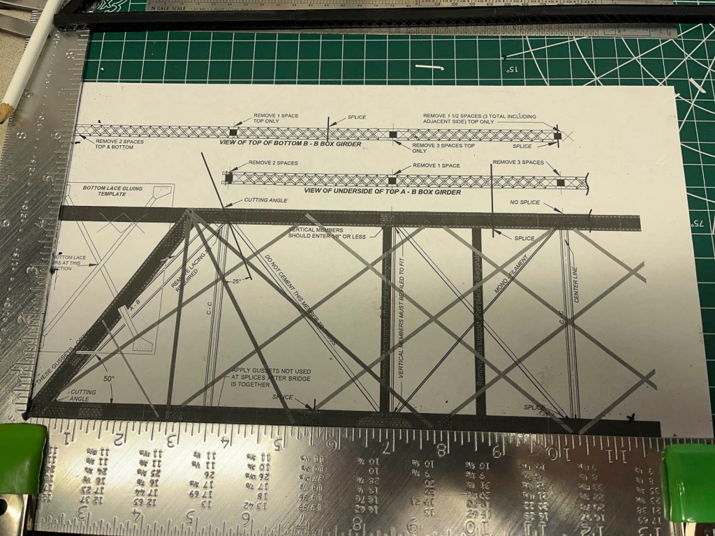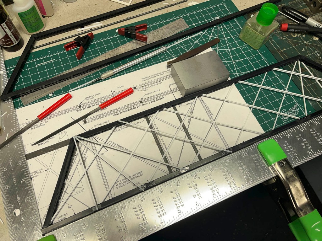 It then became a game of connecting the dots, or more accurately, connecting the lines. I used Evergreen Scale Models and Plastruct components to replicate the trusses and bracing. With some judicious use of Tamiya cement, the rather intricate arrangement went together much faster and cleaner… the second time around.