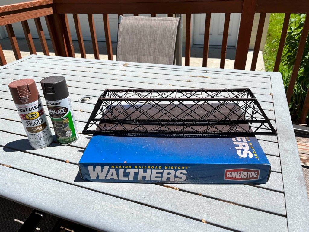 The completed bridge was painted and weathered with various rattle can spray paints. I used Rust-Oleum Camo Brown as the base coat, then lightly dusted with a rust colored primer paint. The paint will atomize by holding the can at a distance from the model before it hits the surface, creating a textured look and feel. PanPastel powders were then applied in strategic locations.