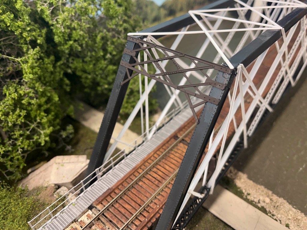After completing the lacing on the trusses, I fit them onto the bridge deck to check clearances and level and square them to each other. I could reuse the end bracing from the first version, saving me a little time and effort. While not an exact match for the prototype, enough changes were made to differentiate it from the kit version.
