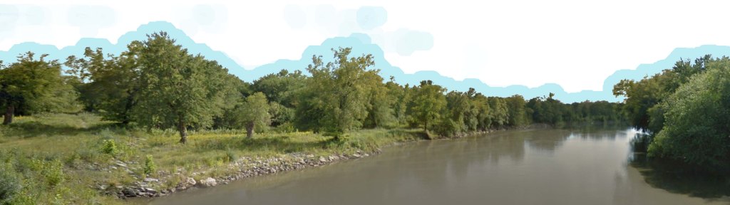 As with most of the photo backgrounds used on The Hills Line, the images of the Iowa River were taken from Google Streetview and built as a collage. Fortunately, the shots available included an excellent reflection of the sky in the water, which helped make the scene appear as it went on for miles and miles.