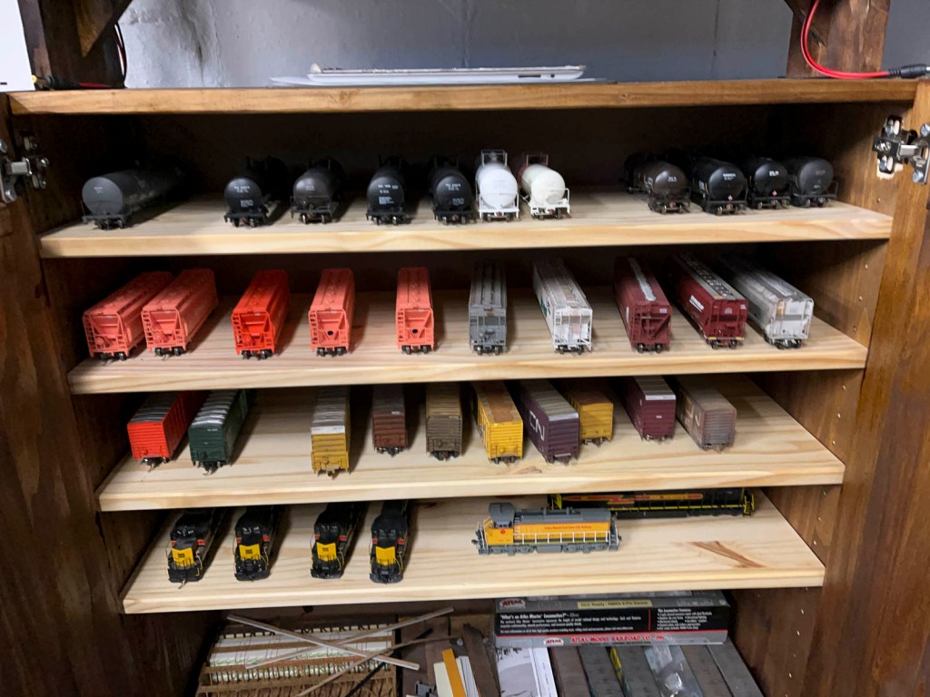 A few years ago I picked up the ubiquitous IVAR Cabinet to use as motive power and rolling stock storage. The case was placed directly underneath the Maiden Lane interchange track, allowing me to quickly fiddle whole trains on and off the layout.