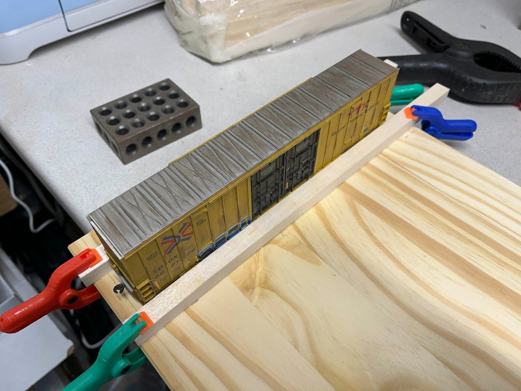 It was just a manner of measuring, gluing, and clamping each strip until dry, then trimming and sanding them to fit. Each resulting pocket is snug enough to align each car while wide enough to avoid damaging delicate details.