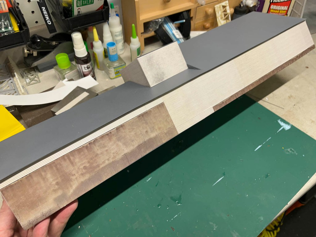 The seams between the individual sheets were carefully planned to fall in strategic spots on the front wall. The seams themselves were then hidden with downspouts made from styrene strip, matching the shape, color, and spacing of the prototype. Window casings and corner trim pieces were also modeled.