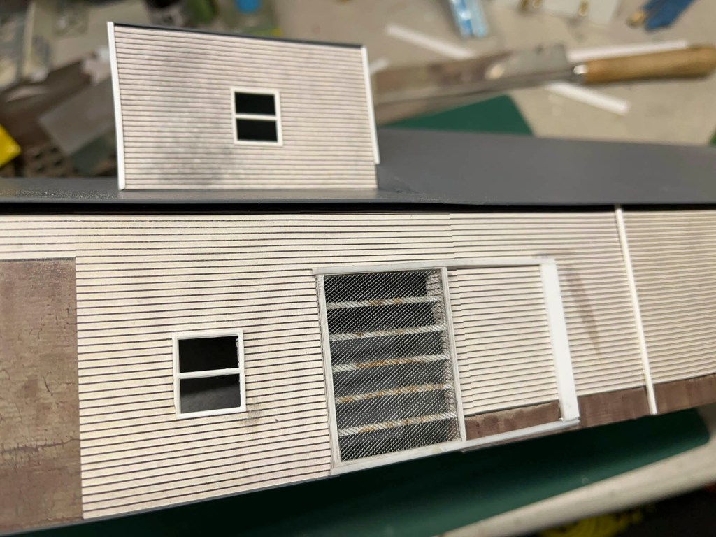 The large sliding grain door was scratchbuilt from styrene strips and some mesh screen. I went ahead and weathered the inside of the door before attaching the screen, since it wouldn’t be accessible after it was installed.