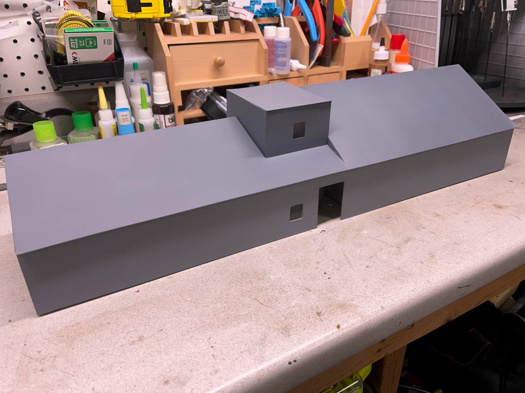 I then painted the entire structure with Rust-oleum flat gray primer spray paint. The color is neutral enough to help blend in all the individual parts into one complete complex. It will also guarantee that any bare spots won’t draw attention to themselves.