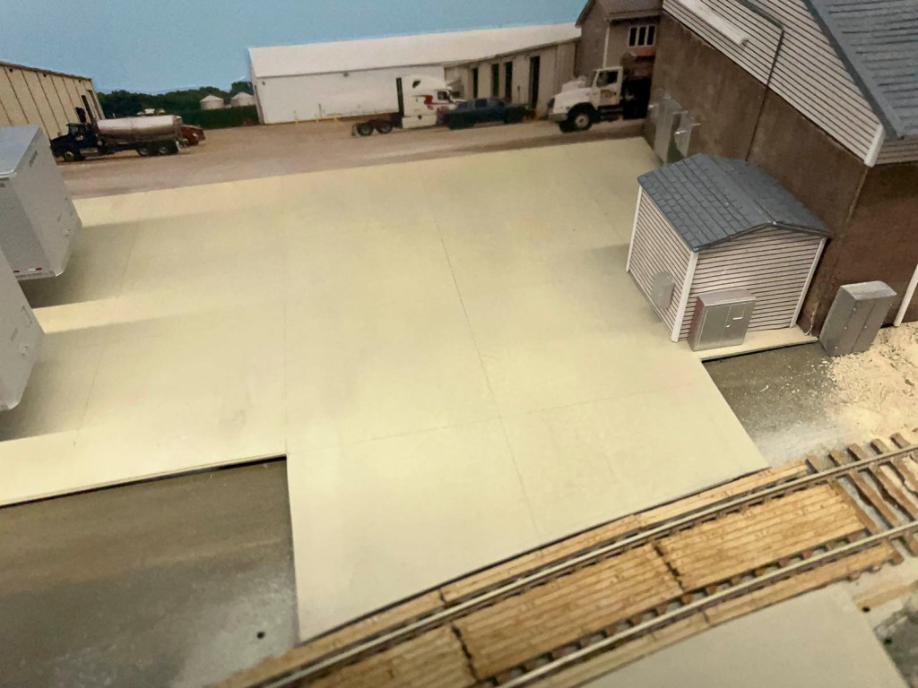 After the concrete sections were glued down, I spent a fair amount of time blending everything together with PanPastels. The lot is very visible portion of the front door to the layout, so I want it to flow into the photo backdrop as smoothly as possible.