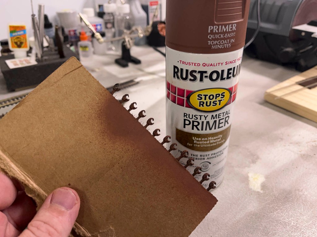 That same piece of cardboard makes a great holder and mask for painting and weathering. I lightly spray the couplers using Rust-oleum Rusty Metal Primer. Too heavy an application will gum up the joints and make the coupler useless. An equally light dusting of PanPastels completes the process.