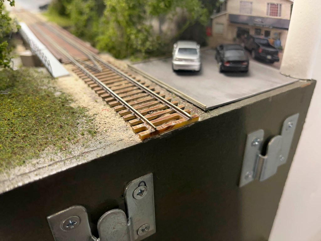 I used copious amounts of construction adhesive, along with track gauges and alignment ribbons, to make sure everything stayed in place. The result is a near-perfect connection from lift-out to layout with little to no bump in the transition.