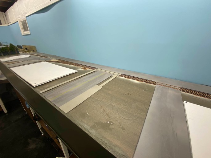 Reconstruction of the Lafayette Street backdrop required a bit more work than just paint and glue. However, the overall effect is far stronger and cleaner than my first effort, and offers a vista unique to The Hills Line. I've come to understand the pros and cons of using rolled aluminum flashing for my backdrop. On … Continue reading Going For Distance
